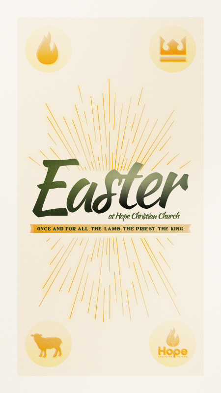 Join us at Hope Christian Church to celebrate the resurrection of Christ, who is once and for all, the Lamb, the Priest, and the King! Our dance, drama, and music ministries have also prepared a special treat that you don't want to miss.